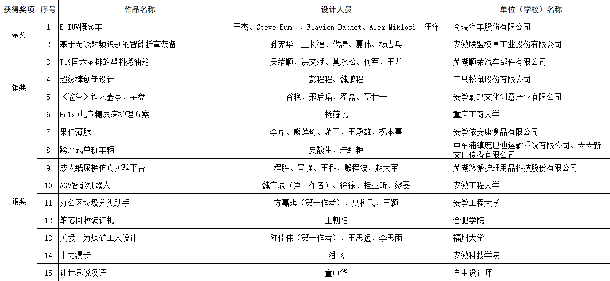 最終,來(lái)自奇瑞汽車的E-IUV概念車(概念設(shè)計(jì))與安徽聯(lián)盟模具工業(yè)有限公司的基于無(wú)線射頻識(shí)別的智能折彎裝備( 實(shí)物產(chǎn)品)榮獲本次大賽金獎(jiǎng),從設(shè)計(jì)理念、產(chǎn)品外形、先進(jìn)技術(shù)在產(chǎn)品中的應(yīng)用以及解決行業(yè)痛點(diǎn)等關(guān)鍵問(wèn)題上,以上作品在行業(yè)中均處于領(lǐng)先水平。同時(shí),來(lái)自順榮股份、三只松鼠、美的冰箱、中車龐巴迪(蕪湖)、安徽工程大學(xué)、安徽工業(yè)大學(xué)等企業(yè)、高校投稿作品也在本次大賽中取得了優(yōu)異的成績(jī)。